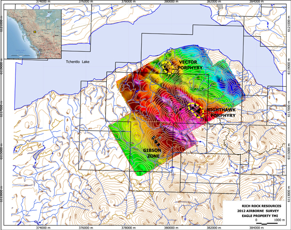 Rich Rock Resources Inc. (the "Company") is pleased to report the preliminary results from recently completed airborne magnetic gradient and radiometric surveys on a portion of the Company’s Eagle Gold-Silver-Copper Property (the "Property"). This program has added insight into the three identified anomalies, especially the Vector porphyry zone.