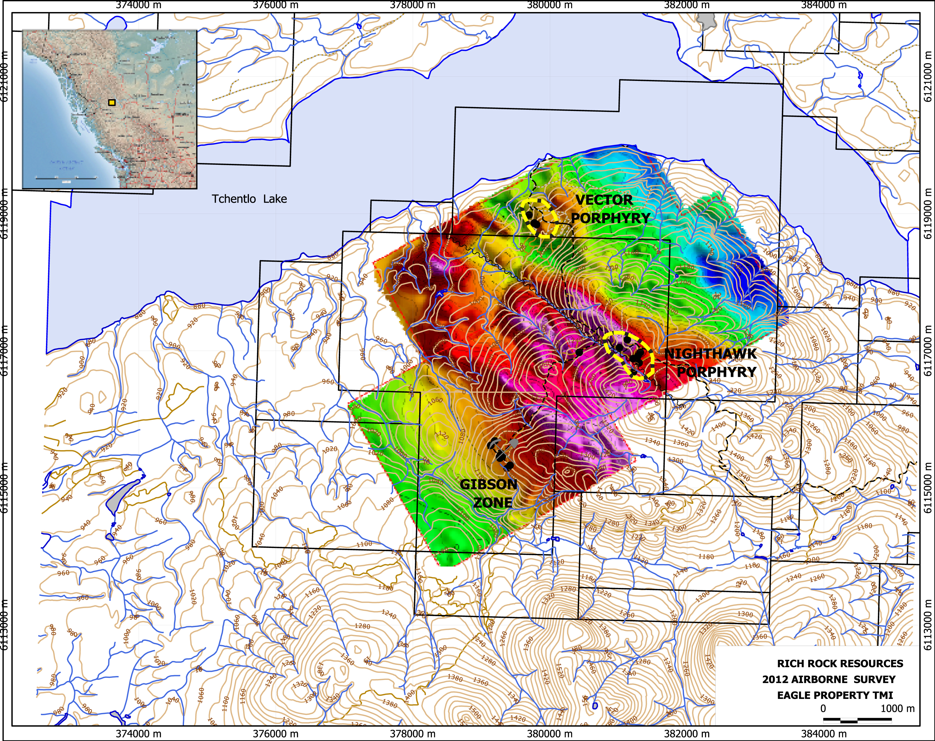 Rich Rock Resources Inc. (the "Company") is pleased to report the preliminary results from recently completed airborne magnetic gradient and radiometric surveys on a portion of the Company’s Eagle Gold-Silver-Copper Property (the "Property"). This program has added insight into the three identified anomalies, especially the Vector porphyry zone.